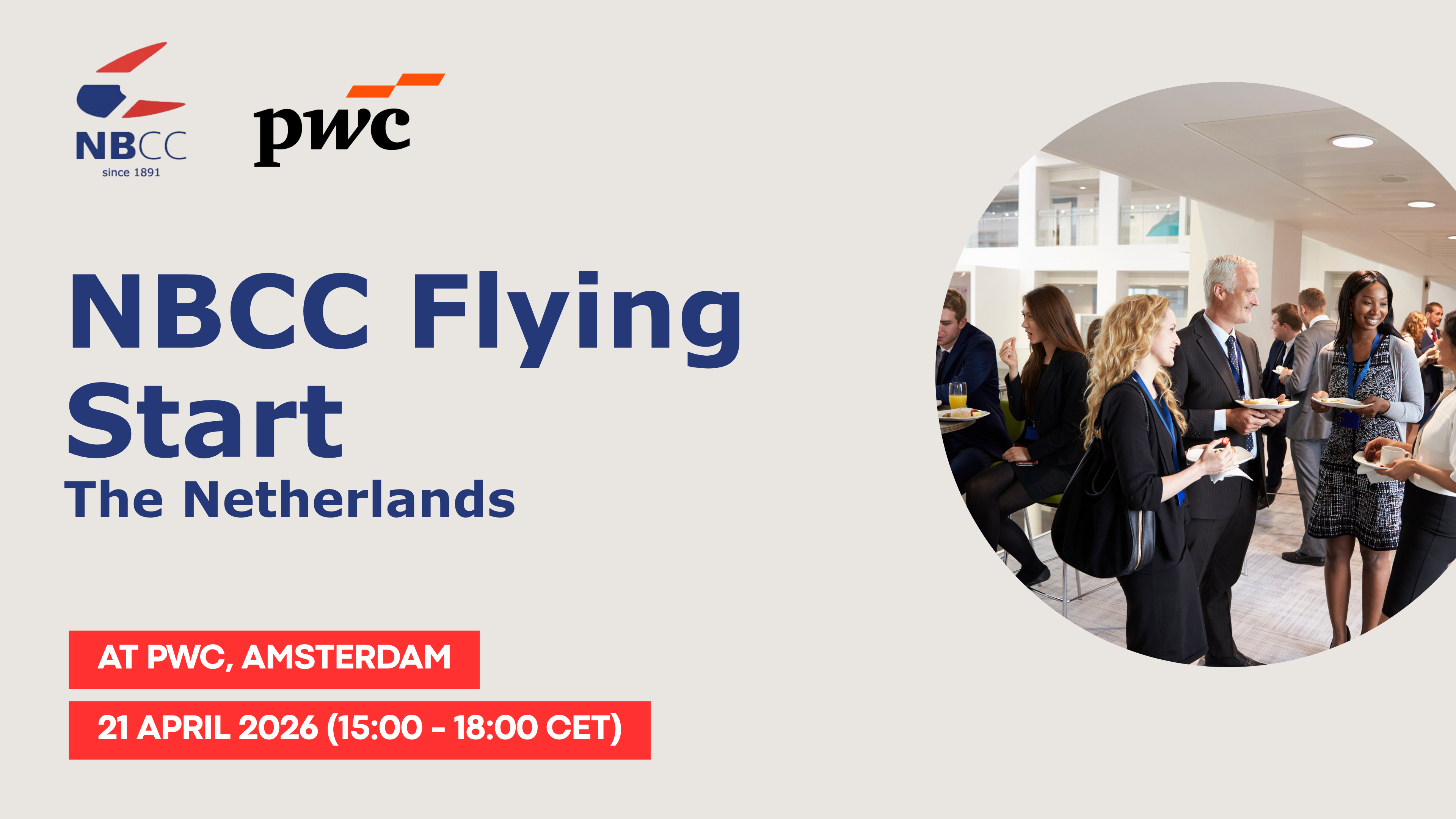 We are delighted to invite you to the NBCC Flying Start NL event on 21 April 2026 from 15:00 - 18:00 CET at PwC in Amsterdam (Joseph Schumpeterstraat 1, 1066 BX – Amsterdam Westgate 2, Executive Meeting Floor, 11th floor).